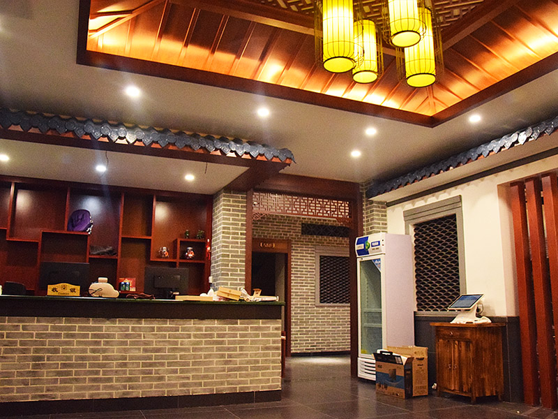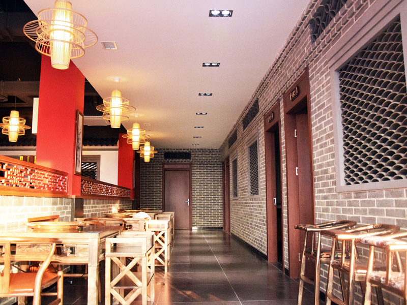 進門前廳使用仿青磚墻面配以紅漆仿古式門窗框架,木質柵格窗與亭頂式圖案吊頂,塑造仿清朝磚亭效果,對稱布局莊重又大氣。
