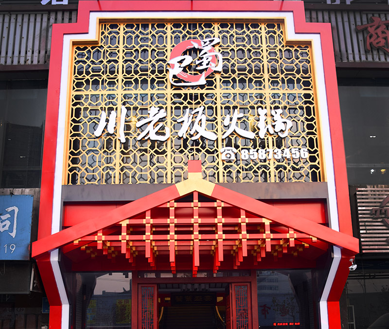 外觀使用仿古式飛檐門頭,金紅配色既端莊復古又恢弘大氣,現代抽象柵格結構增添現代藝術感,鏤空紋樣把傳統圖案與現代性相融合創新,使人眼前一亮。